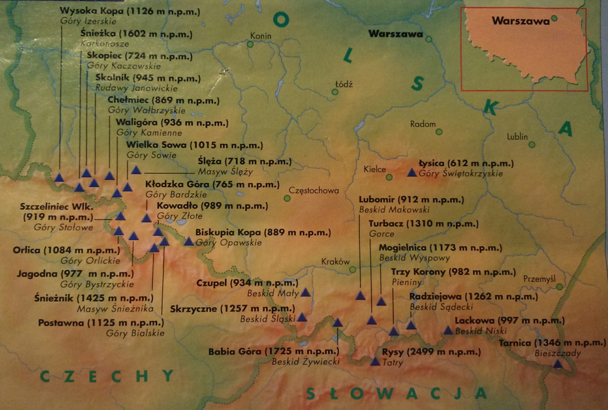 W Górach Świętokrzyskich uwzględniono tylko Łysicę, pomimo tego, że są one podzielone na dwa główne pasma.